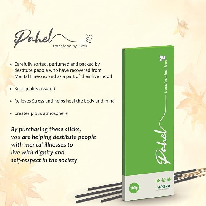 - “Pahel, meaning initiation, symbolizes the beginning of a transformative journey for destitute individuals who have bravely faced and recovered from mental illnesses but lack family and social support. Each Pahel incense stick, lovingly sorted, scented, and packed by these professionally trained individuals, represents a powerful journey of occupational rehabilitation and hope.”